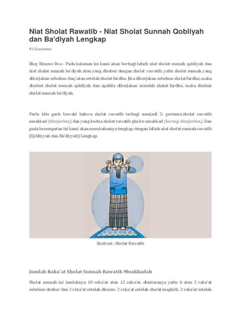 Pengertian, niat, tata cara &… sholat rawatib : Mengenai jumlah salat sunah rawatib mu'akkad ada 12 rakaat, yaitu: Empat rakaat sebelum dzuhur, dan dua rakaat sesudahnya, dan dua. Shalat sunnah rawatib ghoiru mu'akkad; Bacaan niat sholat rawatib qobliyah dan ba'diyah sebelum subuh, zuhur dan setelah zuhur, maghrib, isya, lengkap dengan artinya. 2 raakat sebelum shalat subuh. Sholat rawatib adalah sholat sunnah yang dikerjakan sebelum atau sesudahnya sholat wajib 5 waktu atau sholat fardhu. 2 rakaat seseudah shalat isya. Anjuran melaksanakan sholat sunnah qobliyah dan ba\'diyah ini disebutkan dalam hadist nabi saw:. Inilah pendapat jumhur ulamak mazhab yaitu maliki dan syafie dan hanbali. Tata cara melaksanaan shalat duhur pengganti shalat jumat, sama dengan biasanya sesuai disyaratkan. Niat shalat qabliyah dzuhur 4 rakaat Saya niat shalat sunnah sebelum dzuhur dua rakaat, dengan menghadap kiblat karena allah ta'ala.