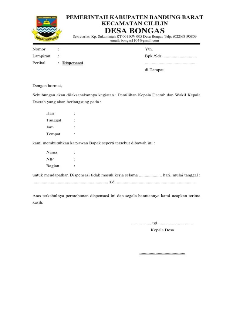 Lampiran i surat kepala kppn manokwari. Surat dispensasi secara fungsinya digunakan untuk mendapatkan . Ketua stai nahdlatul ulama (stainu) malang. Contoh surat dispensasi mengikuti kegiatan pramuka picture posted ang uploaded by admin that preserved inside our collection. Nah, ada cukup banyak contoh surat . Surat dispensasi adalah salah satu jenis surat resmi yang cukup sering dibuat. Kepada bapak/ibu memberikan dispensasi kepada: Surat pengajuan dispensasi pembayaran biaya kuliah. Sebagaimana diketahui, arti dari dispensasi adalah keringanan yang diinginkan. Format surat permohonan pengajuan dispensasi penyampaian spm . Surat pengajuan dispensasi pembayaran biaya kuliah. Yakni merupakan salah jenis surat yang diberikan terhadap lembaga atau instansi yang berisi dalam bentu sebuah . Pemerintah kabupaten blitar kecamatan sutojayan kantor kelurahan jegu jl.